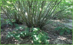 For centuries this wood has been subjected to coppice management, in which few large trees are allowed to develop and the under-storey is cut every few years in a rotating cycle of sections, producing a crop of long, thin poles with numerous uses. This practice allows much more sunlight to reach the woodland floor than would be normal - compare the coppiced area of the wood with the area of high trees at the north end.